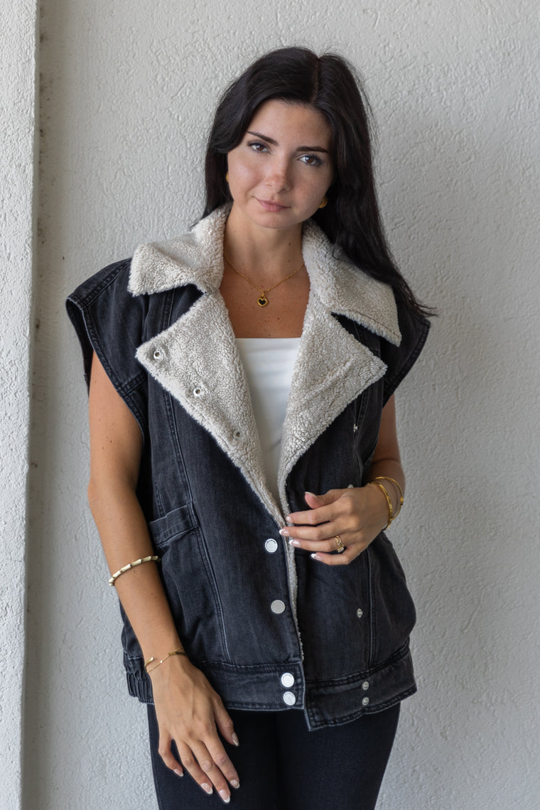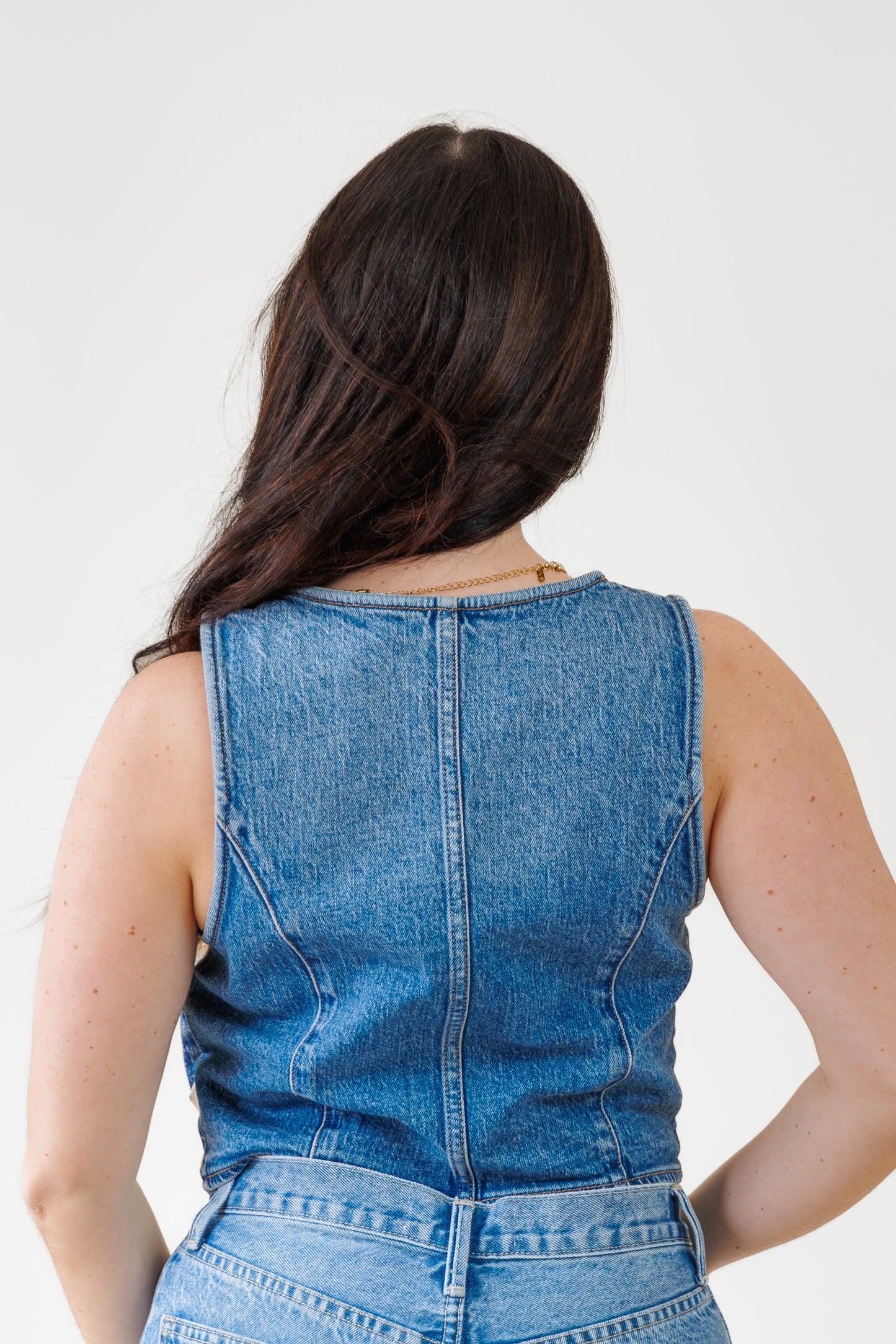 Style Tip: This denim vest with blanket stitching is a must-have layering piece—wear it over a crisp button-down for a polished look, or style it with wide-leg jeans and boots for a trendy double-denim outfit.